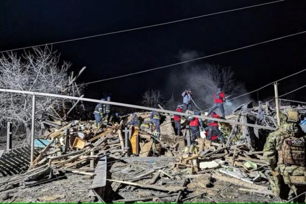 Upaya penyelamatan berlanjut hingga malam hari. Gambar yang diposting online oleh gubernur regional Vadym Filashkin menunjukkan tim memilah tumpukan puing-puing yang membara dalam kegelapan serta kendaraan yang terbakar.