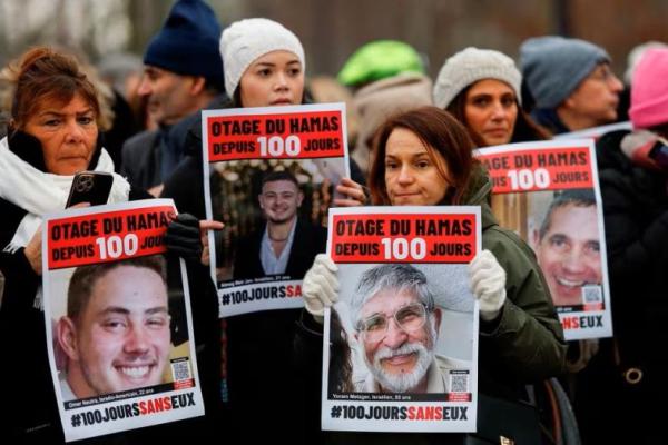 Orang-orang memegang poster yang menggambarkan sandera Israel di Gaza selama acara 100 hari 100 suara di depan Opera Bastille di Paris, Prancis, Januari 14, 2024. Foto: Reuters