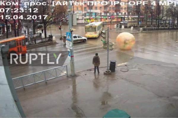 Sebuah rekaman CCTV menunjukkan seorang pria berjalan melewati kendaraan melintas dengan menggunakan balon air di sebuah kota di Rusia. Pria itu tampak santai berjalan di dalam bola air dengan santai dan tak menghiraukan orang di sekitarnya.
