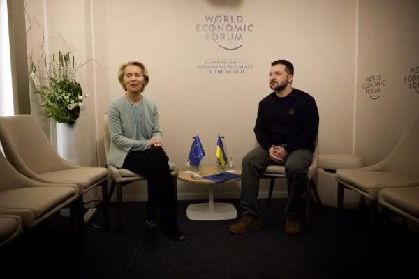 Presiden Ukraina Volodymyr Zelenskiy dan Presiden Komisi Eropa Ursula von der Leyen menghadiri pertemuan di Davos, Swiss 16 Januari 2024. Handout via Reuters