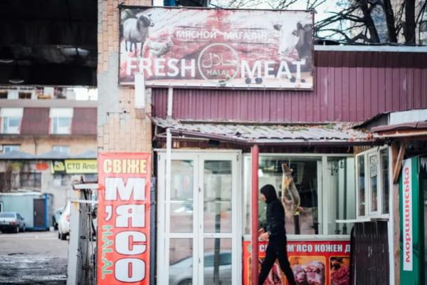 Toko daging yang dikelola warga Palestina di Jalan Dehtiarivska di Kyiv, Ukraina. Daerah ini adalah rumah bagi salah satu masjid di Kyiv dan merupakan titik fokus komunitas Muslim di kota tersebut. (FOTO: AL JAZEERA)