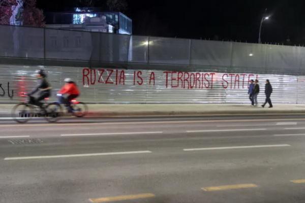 Orang-orang melewati grafiti anti-Rusia yang dilukis pada penghalang konstruksi di sebuah jalan di Tbilisi, Georgia. (FOTO: REUTERS)
