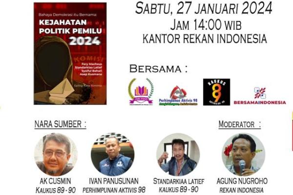 Terkait kondisi demokrasi saat ini, Agung mengatakan, Rekan Indonesia akan membedah buku "Kejahatan Politik Pemilu 2024” yang digelar Sabtu (27/1/2024).