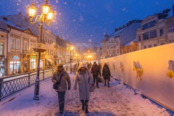 Orang-orang berjalan di hari bersalju di Uzhhorod yang dihuni minoritas etnis Hongaria yang cukup besar, di wilayah Zakarpattia, Ukraina 30 November 2023. Foto: Reuters