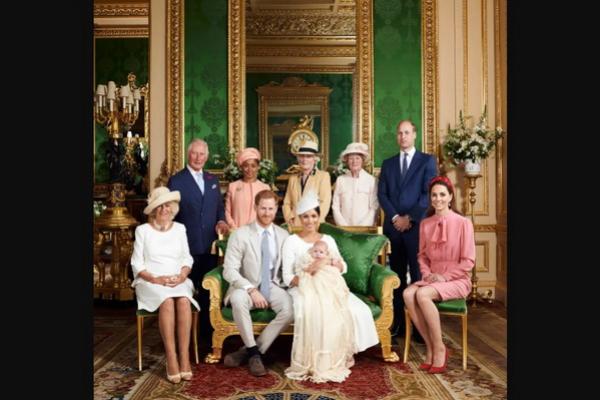 Foto keluarga tersebut menampilkan Pangeran Harry (39), Meghan Markle (42) dan bayi laki-laki mereka di sofa yang dikelilingi oleh Kate Middleton, Pangeran William, Raja Charles III, Ratu Camilla dan Doria Ragland.
