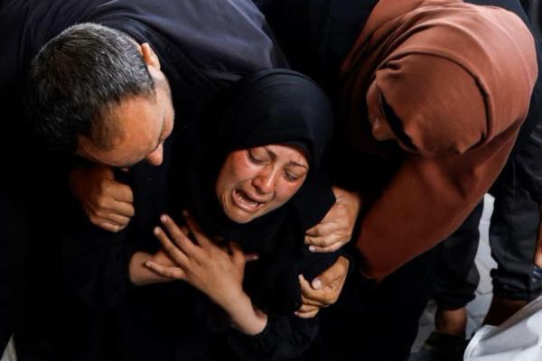 Seorang wanita bereaksi di samping jenazah warga Palestina yang tewas dalam serangan Israel, di selatan Jalur Gaza, 16 April 2024. REUTERS