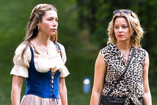 Jessica Biel dan Elizabeth Banks berfoto di lokasi syuting The Better Sister di New York City pada 17 Juni 2024. (FOTO:THEIMAGEDIRECT.COM)