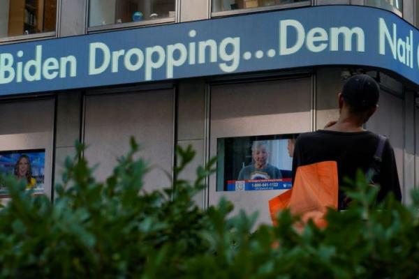 Seseorang melihat ticker berita tentang pengumuman Presiden AS Joe Biden batalkan pencalonannya kembali, di Manhattan, New York City, AS, 21 Juli 2024. REUTERS