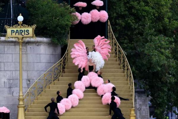 Nuansa Prancis bahkan lebih terasa dari alat peraga berbulu merah muda yang mereka kenakan saat menari, saat mereka menuruni tangga megah yang terinspirasi oleh Grand Palais.
