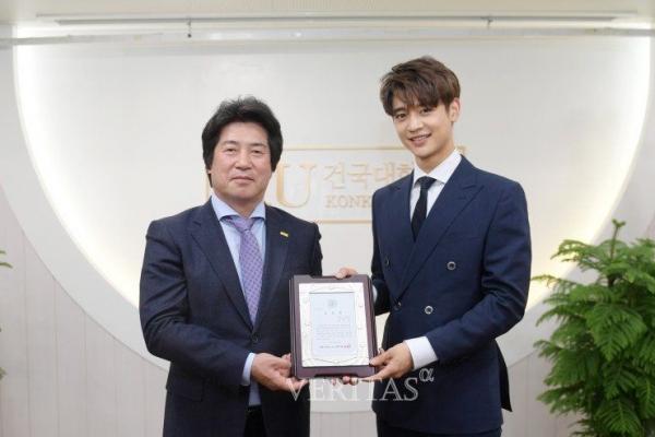 SHINee Minho saat menerima penghargaan sebagai duta selebritis Konkuk University (Foto: Koreaboo)