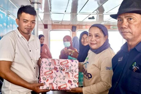 Ayah Ferra Oktaviana Pangkilang (kiri) yang lahir di atas KMP Pangkilang menerima bingkisan dari PT ASDP. Foto: asdp/jurnas