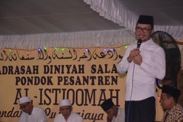 Menaker M Hanif Dhakiri memberikan sambutan pada acara Istighotsah Kubro dan Haflah Ahirussanah di Pondok Pesantren Al Istiqoma, Kebondles, Subang, Jawa Barat, Rabu malam, 17 Mei 2017.