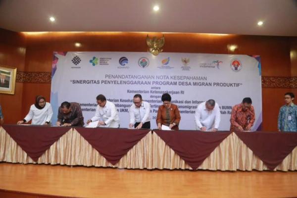 Penandatangan nota kesepahaman “Sinergitas Penyelenggaraan Program Desa Migran Produktif” yang ditandatangani delapanmenteri di Kantor Kementerian Ketenagakerjaan, Jakarta, Selasa, 30 Mei 2017.