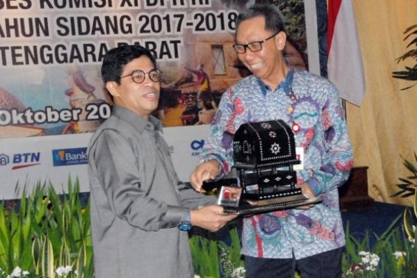 Ketua Tim Kunjungan Kerja Komisi XI DPR RI Soepriyatno menerima cendramata dari Anggota Dewan Komisioner OJK Tirta Segara usai melakukan pertemuan di Mataram, Lombok (Foto: Humas DPR)