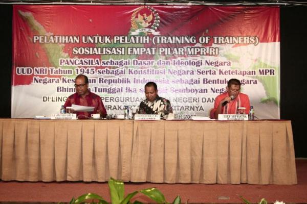 Wakil Ketua Lembaga Pengkajian MPR Ahmad Farhan Hamid menyampaikan materi Training of Trainers (pelatihan untuk pelatih) Empat Pilar MPR untuk kalangan dosen perguruan tinggi negeri dan swasta se-Surakarta di Hotel Paragon, Solo, Jumat (24/11)