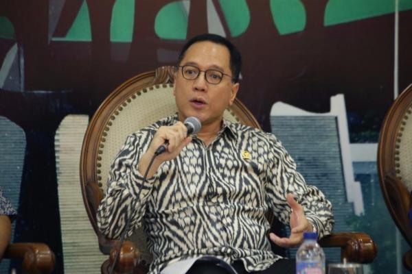 Anggota MPR RI Fraksi Partai Hanura, Arief Suditomo saat menjadi narasumber pada dialog pilar negara di Ruang Media Center Komplek Parlemen, Senayan, Senin (27/11)