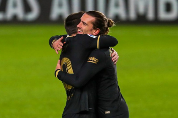 Messi dan Griezmann berpelukan usai mencetak gol untuk Barcelona (foto:Barcaofficial)