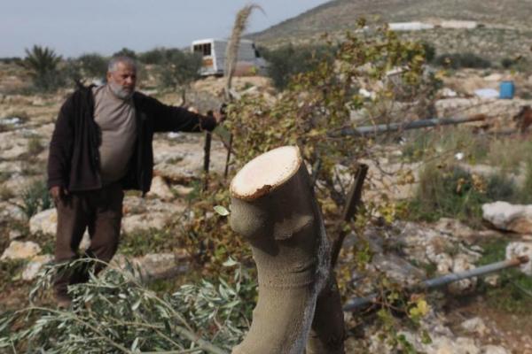 Seorang pria Palestina menunjukkan pohon setelah dihancurkan oleh pasukan Israel di Tubas, Tepi Barat, 27 Januari 2021. [Nedal Eshtayah - Anadolu Agency]