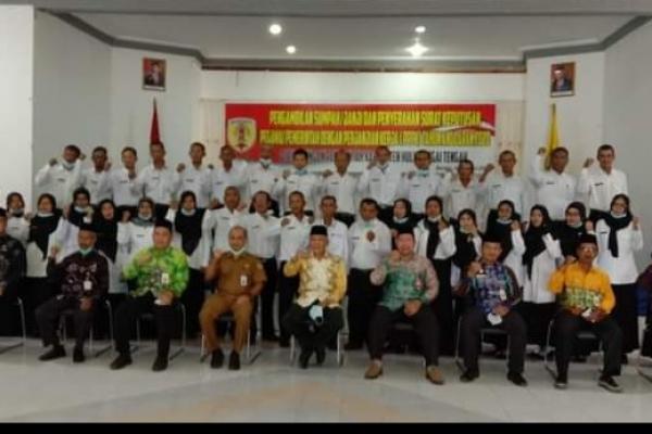 Bupati Hulu Sungai Tengah, H.A Chairansyah saat pelantikan mengucapkan selamat bertugas kepada para penyuluh yang dilantik menjadi P3K.
