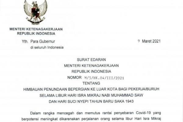 Imbauan ini tertuang dalam Surat Edaran (SE) Menteri Ketenagakerjaan RI Nomor M/5/HK.04/III/2021 tentang Imbauan Penundaan Bepergian Ke Luar Kota Bagi Pekerja/Buruh Selama Libur Hari Isra Mikraj Nabi Muhammad saw. dan Hari Suci Nyepi Tahun Saka 1943. Surat edaran ini tertanggal 9 Maret 2021.