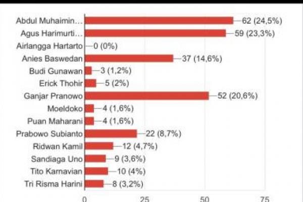 Hingga Sabtu (29/5/2021), Gus AMI unggul dengan perolehan suara 24,5 persen. Disusul Agus Harimurti Yudhoyono alias AHY (23,3%), Ganjar Pranowo (20,6%), Anies Baswedan (14,6%), Prabowo Subianto (8,7%), Ridwan Kamil (4,7%), Tito Karnavian (4%), Sandiaga Uno (3,6%), dan Tri Rismaharini (3,2%). Selanjutnya, Erick Thohir (2%), Moeldoko (1,6%), Puan Maharani (1,6%), Budi Gunawan (1,2%), dan Airlangga Hartarto (0%).