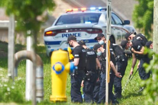 Sederet petugas polisi mencari bukti di lokasi kecelakaan mobil di London, Ontario pada Senin, 7 Juni 2021. Polisi mengatakan banyak orang tewas setelah beberapa pejalan kaki ditabrak mobil pada Minggu malam. (Geoff Robins/The Canadian Press via AP)