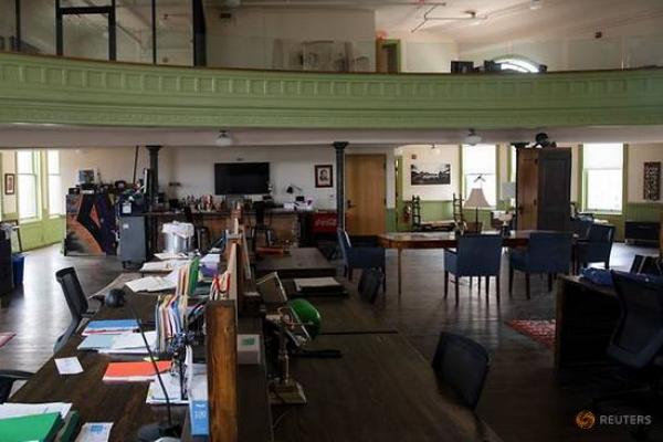 Meja-meja kosong di dalam Grand Army of the Republic Building saat karyawan terus bekerja dari jarak jauh karena pandemi penyakit coronavirus (COVID-19) di Detroit, Michigan, AS, 8 Juni 2021. REUTERS/Emily Elconin