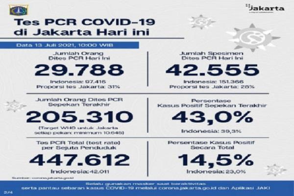 Jakarta, Jurnas.Com - Kepala Bidang Pencegahan dan Pengendalian Penyakit, Dinas Kesehatan Provinsi DKI Jakarta, Dwi Oktavia memaparkan, berdasarkan data terkini Dinas Kesehatan DKI Jakarta, dilakukan tes PCR sebanyak 42.555 spesimen.