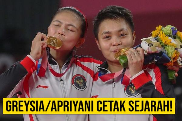 JurnasTV - Pasangan ganda putri Indonesia, Greysia Polii/Apriyani Rahayu berhasil menyumbangkan satu medali emas dalam Olimpiade Tokyo 2020, setelah mengandaskan pasangan China Chen Qing Chen/Jia Yi Fan dua set sekaligus. Keduanya menorehkan sejarah baru, sebab Indonesia kini tercatat sebagai negara yang telah meraih emas di seluruh nomor cabang olahraga bulu tangkis.