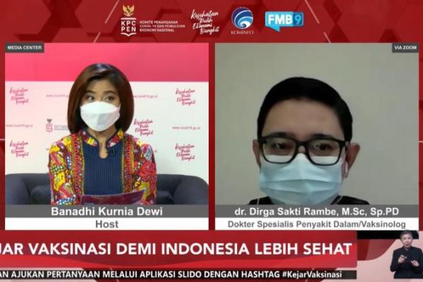 Dialog Kabar Kamis di Media Center KPCPEN (5/8) membahas pentingnya vaksinasi dan menjaga kesehatan di tengah lonjakan kasus COVID-19, dengan mengundang dr. Dirga Rambe, M.Sc, Sp.PD (Dokter Spesialis Penyakit Dalam/Vaksinolog).