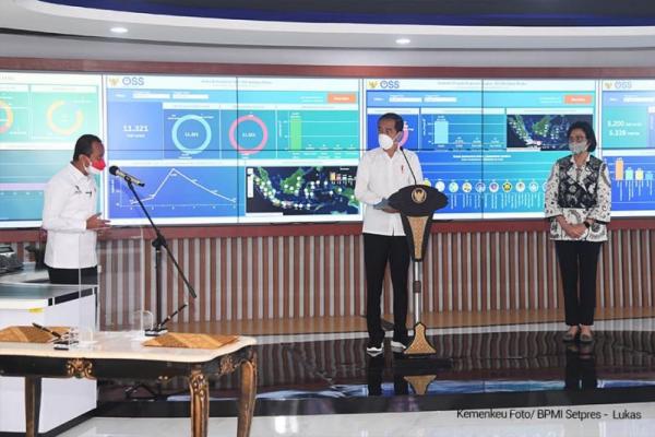 Presiden Joko Widodo bersama Menteri Keuangan dan Menteri Investasi/BKPM meluncurkan Sistem Online Single Submission (OSS) Berbasis Risiko pada Senin (09/08), di Kantor Kementerian Investasi/BKPM.