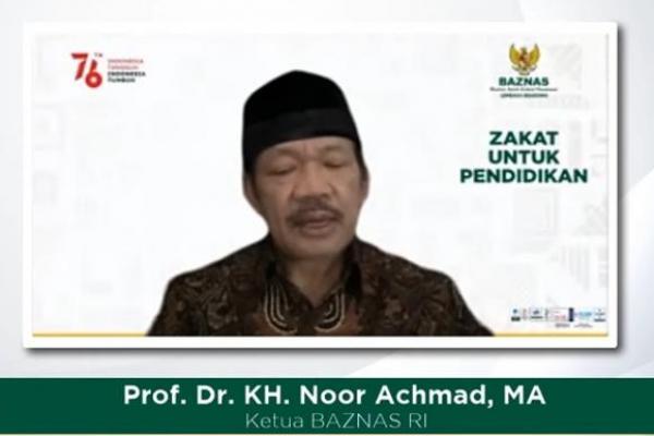 Ketua BAZNAS, Prof. Dr. KH. Noor Achmad saat menyampaikan sambutan dalam pembukaan program Beasiswa Cendekia BAZNAS Perguruan Tinggi Dalam Negeri (BCB PTN) Tahun 2021