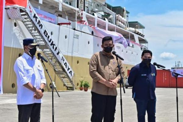 Menteri Perhubungan Budi Karya Sumadi, Menteri BUMN Erick Thohir dan Walikota Medan Bobby Nasution meninjau pelayanan isolasi terpusat (isoter) terapung KM Bukit Raya, di Pelabuhan Belawan Medan, Sabtu (21/8). (Foto: Ist)